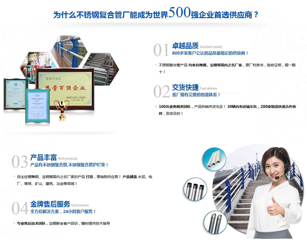 公司全體員工自2003年從事工程制作、施工以來,積累了許多施工技術和經驗,能在短期內,高質、高效的完成各種工程,公司現引進國際先進項目管理體制和市場研發(fā)應用能力,從事專業不銹鋼/碳素鋼復合管大型道橋欄桿設計、生產、制作、安裝。 不銹鋼復合管是由不銹鋼管與碳素鋼管復合而成的,技術含量高,設備精密,工藝先進產品質量穩(wěn)定,采用電腦自動控制。產品具有純不銹鋼外表豪華、美觀和普通碳素鋼管強度高的特點,其價格低于純不銹鋼管,是價昂不銹鋼結構裝飾管材的替代產品。產品廣泛用于市政公用工程施工,鋼結構、網架工程施工,石油石化、市政設施、路橋護欄、公路交通工程施工;建筑裝飾工程施工;體育場地設施工程施工交通格柵、鐵路隔離網、建筑裝飾、路燈、站牌、鋼結構網架、家具、車船制造、城市管網、輸油輸氣、摩托車保險杠、晾衣架、自行車車把等;產品規(guī)格φ9.5mm—φ219mm,壁厚0.5mm—18.0mm,表面光亮…